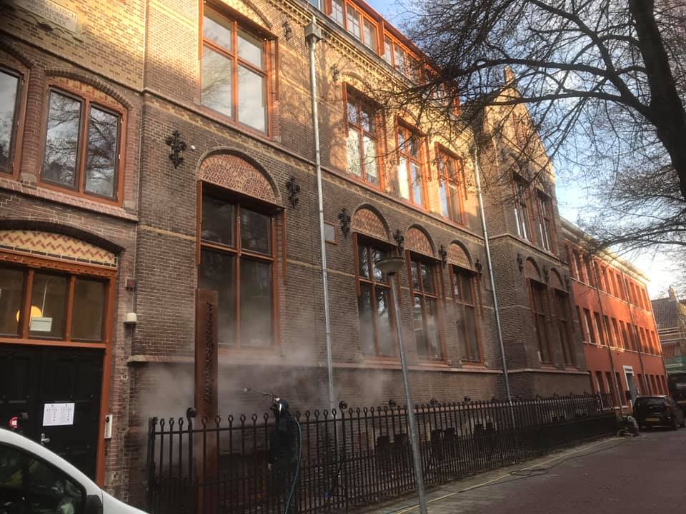 Met koudwater en hogedruk worden de gevels afgespoten. Eventueel ook met warm water of een vuilfrees.