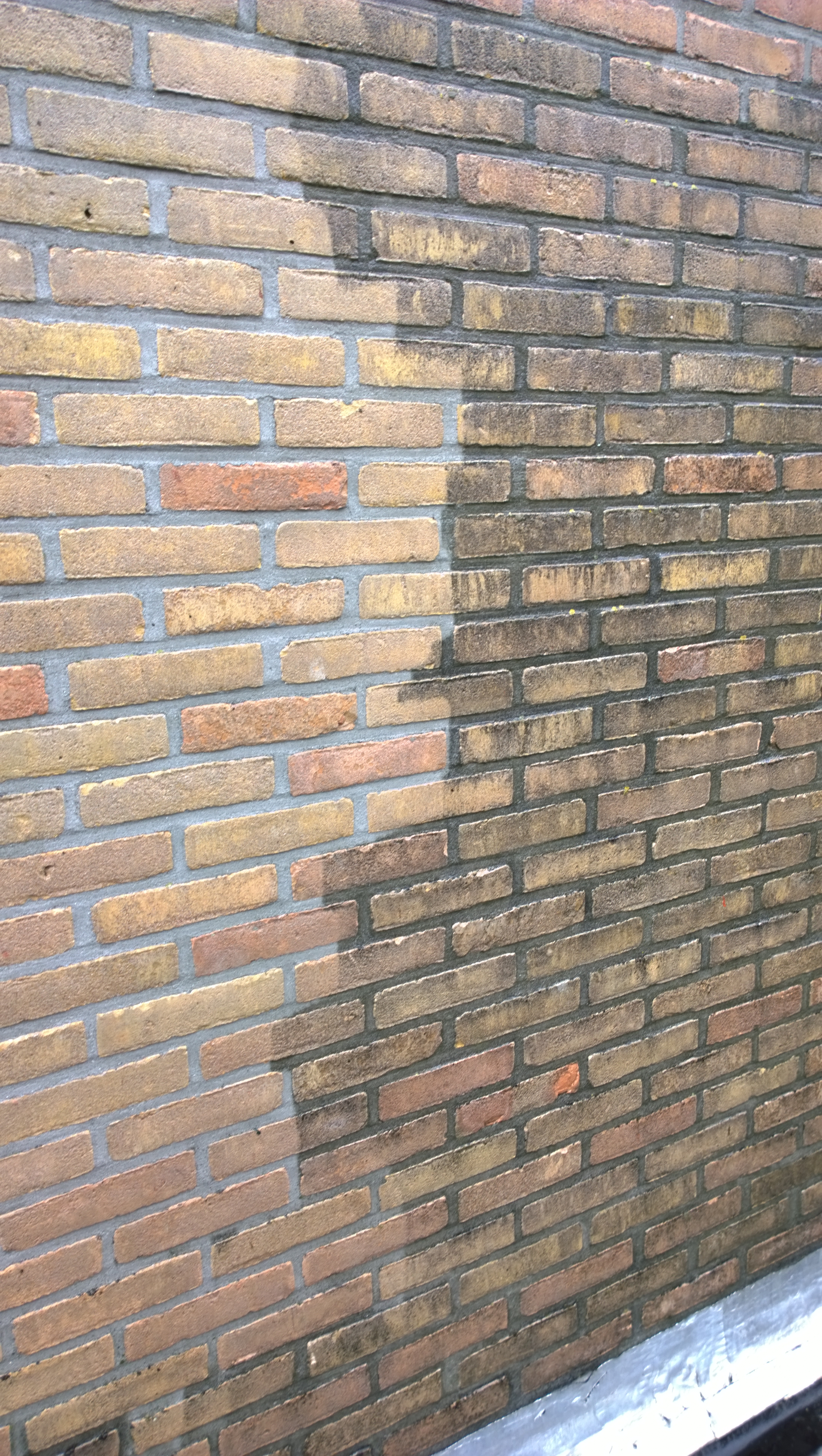 Dit de manier van reinigen in de restauratie. Met warm water en aangepaste druk wordt de gevel afgespoeld om zo de patinalaag en het voegwerk te beschermen.